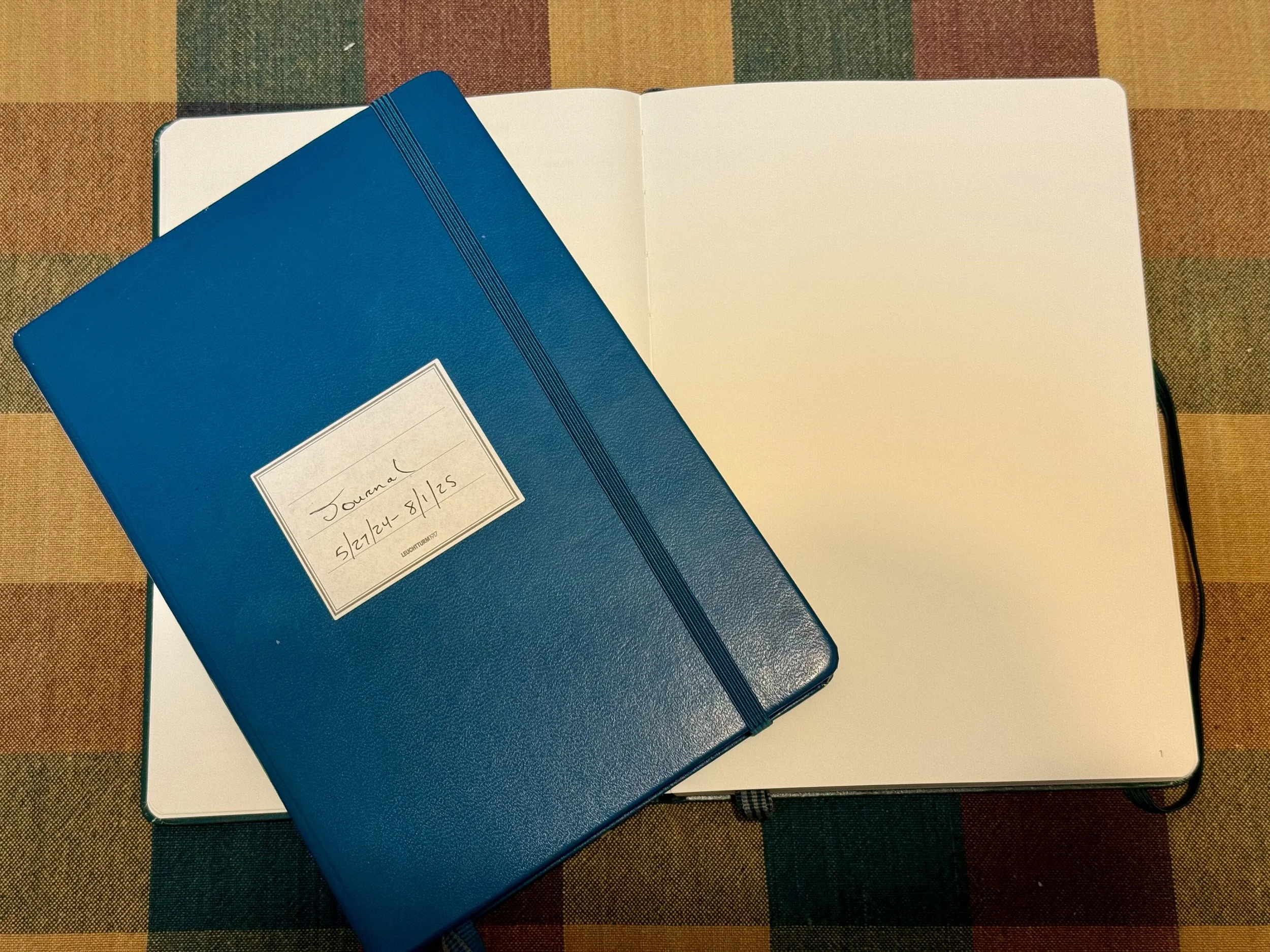 I use a brand of hardcover notebook called Leuchtturm1917 for journaling my personal thoughts, feelings, and prayers. The regular A5/medium size has 251 individually numbered pages and comes with a blank table of contents in the front, two ribbon bookmarks, a set of pre-formatted label stickers to write titles and dates on, and a paper pocket glued inside the back cover for storing random flat things like photos and scrap paper. I looked back at the first entry and discovered I’ve been writing in this particular journal for over a year.